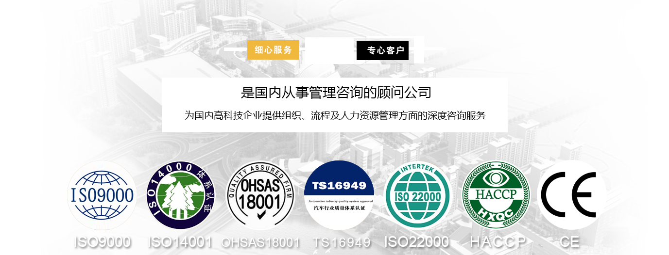 苏州德鑫远盛企业管理有限公司成立于2005年,是国内从事管理咨询的顾问公司,公司致力于引进国外先进的管理思想和方法,结合中国企业实际,为中国高科技企业提供的组织、流程及人力资源管理方面的深度咨询服务。德鑫远盛为长三角地区提供标准体系辅导如ISO9000、ISO14000、OHSAS18000、ISO/TS16949、TL9000、ISO13485、SA8000、QC080000等标准体系;产品认证咨询如CCC、UL、VDE、GS、CE等;产品检测;企业管理专案咨询以及相关教育训练之顾问公司。 德鑫远盛成立始终秉持着“科学、务实”之经营理念在行业内创立前詹性的服务水准,并已成功协助近千家企业获得过SGS、DNV、BSI、TUV、UL、BVQI、CQC、方圆等国内外认证机构颁发之管理体系证书,且均一次性审核通过。其中包括近百家国内外知名企业........
